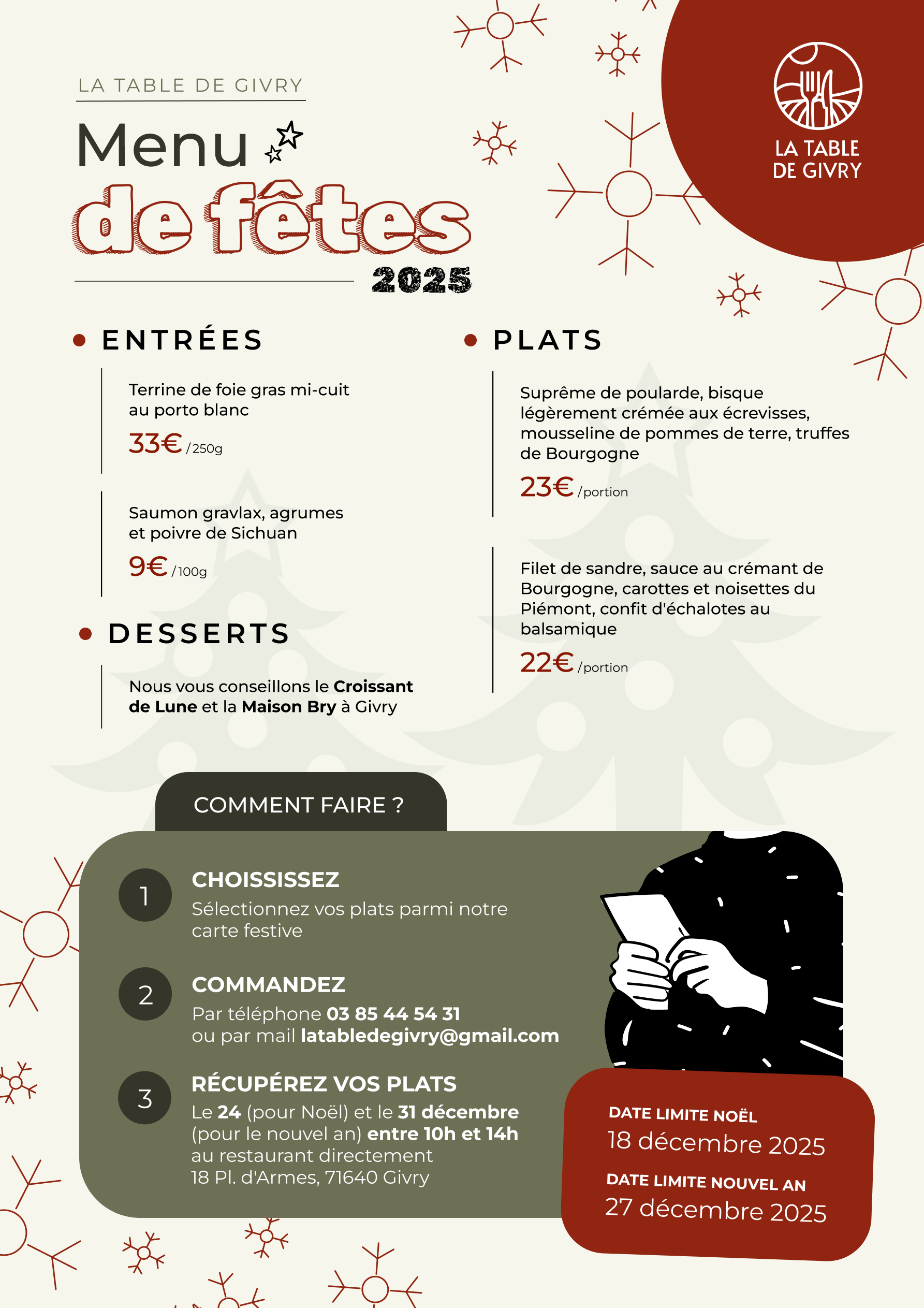 La Table de Givry s’invite chez vous pour les Fêtes ! Cette année, La Table de Givry vous propose de célébrer Noël et le Jour de l’An avec une cuisine raffinée… directement à la maison. Le restaurant sera fermé pendant les fêtes, mais notre équipe vous prépare un menu festif à emporter, pensé pour sublimer vos repas de fin d’année.